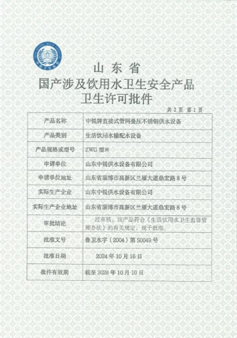 中銳牌直接式管網(wǎng)疊壓不銹鋼