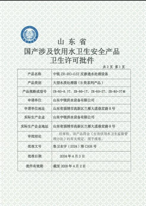 中銳 ZR-RO-0.5T反滲透水處理設(shè)備衛(wèi)生許可批件